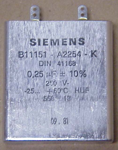| Fabrikat Siemens MKV, sehr hochwertige, niederinduktive Kondensatoren für hohe Strombelastbarkeit. Sehr beliebt als Sieb- Koppel- und Abblockkondensatoren, sowie für Lautsprecherweichen. Achtung, das sind keine kleinen Teile... | Siemens MKV High power capacitors. Those are real power electronics capacitors !! Use in filters where you do not want to use electrolyitcs but take care, they are pretty large. All dimensions metric. Polypropylene in oil, low inductance. We got plenty of real good feedback from customers using those as filter caps, in interstages and even as coupling capacitors. The caps we offer here have been tested and clean and do mainly come from equipment that has been surplused due to modernisation. | Condensateurs haute puissance, Fabrication Siemens, version MKV. Très utile comme condensateur de filtrage, couplage etc. Mais attention, ceux ne sont pas petits. Occasion, testé. | ||||||