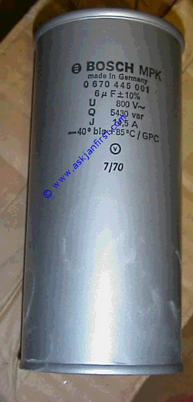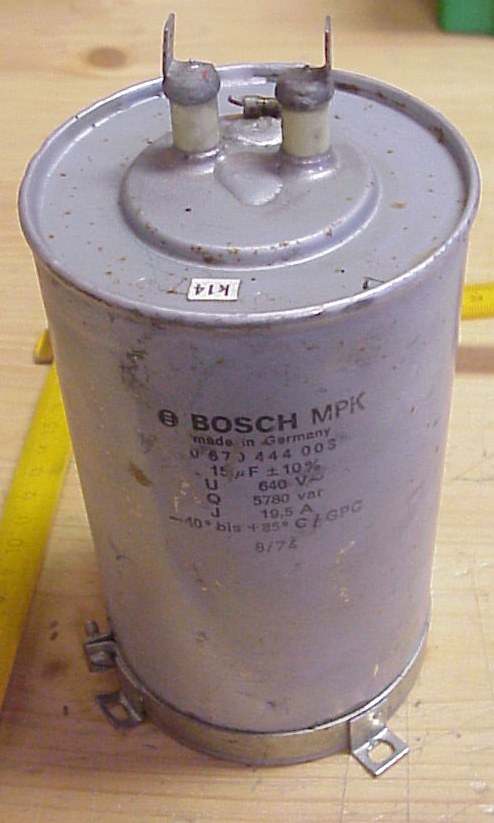KONB15642 | Bosch 15uF 640 VAC = 2kVDC, die Oberklasse unter den Leistungskondensatoren. Ausbau, geprüft 90*150 | Bosch MP 15 MFD 640 VAC = 2kVDC, this is the upperclass of the Bosch MPs, grey painted steel can, tested OK, made around 1970, a true vintage capacitor !!! 90*150 mm diameter times height. | Bosch MP 15uF 640 VCA = 2kVCD. Occasion testé. Condesateur à qualité superieure. Fabriqué environ 1970. Boite acier gris. | 22,90 | 26,56 | Robert Bosch GmbH Robert-Bosch-Platz 1 70839 Gerlingen kontakt@bosch.de |
